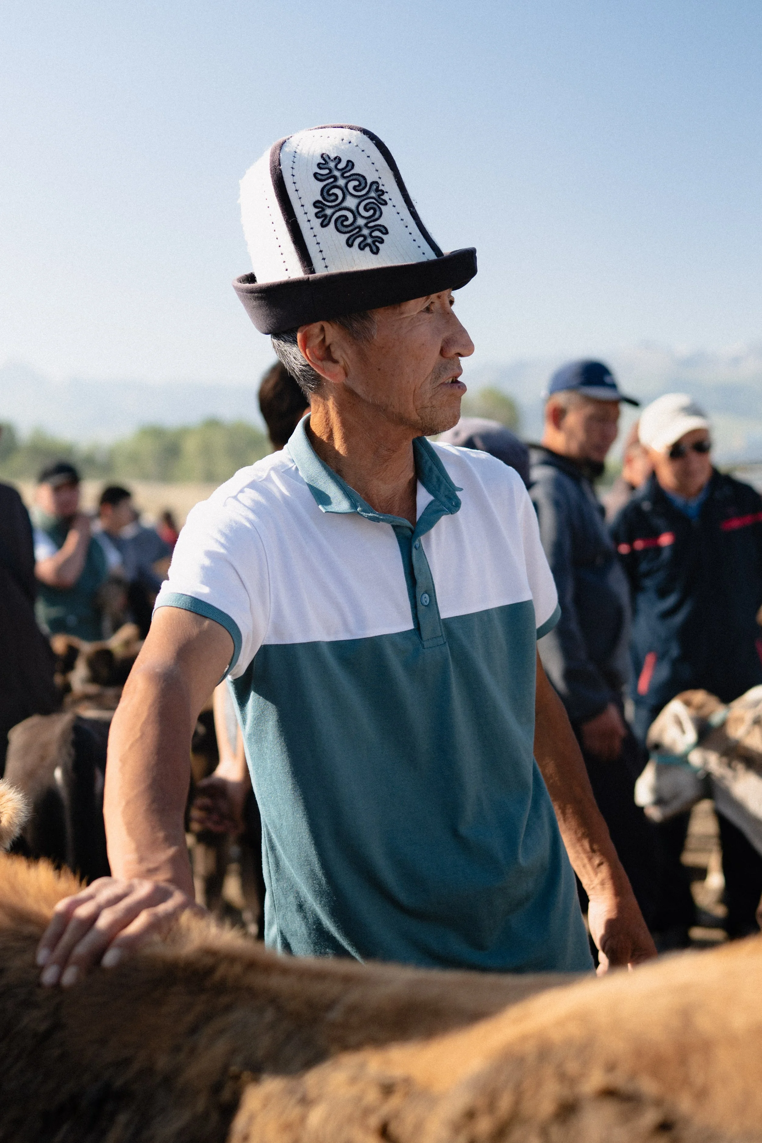 The Kalpak is shaped like the mountains of the Tien Shan mountains and is made of white sheeps felt, representing the snow capped peaks. The hats are decorated with symbols saying something about the owner.